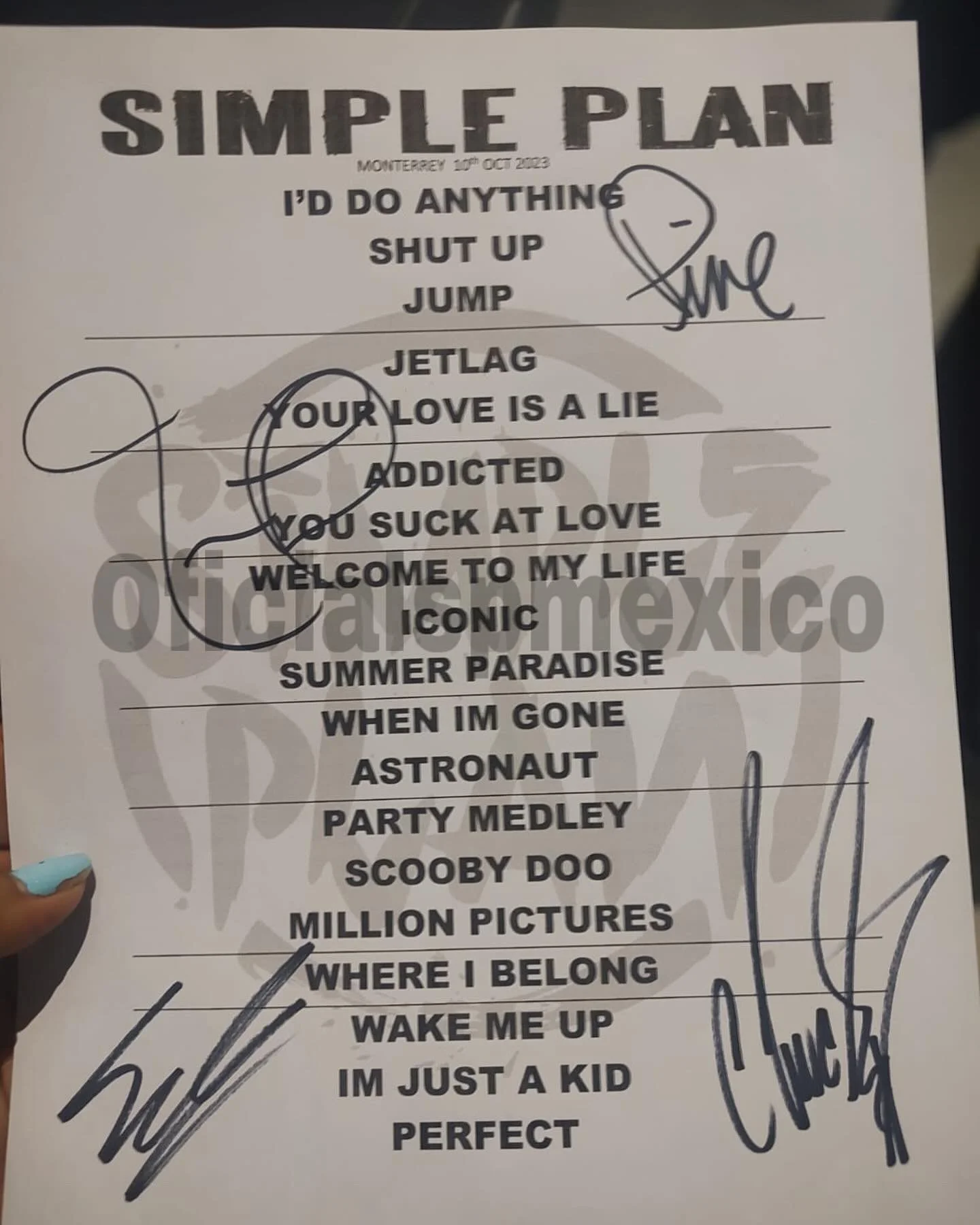 El concierto tuvo canciones desde las más nuevas y obviamente las que no podian fallar son las que nos hacen sentir mucha nostalgia como: Jump, Your love is a lie, Addicted, Welcome to My life, When I´m Gone entre otras.